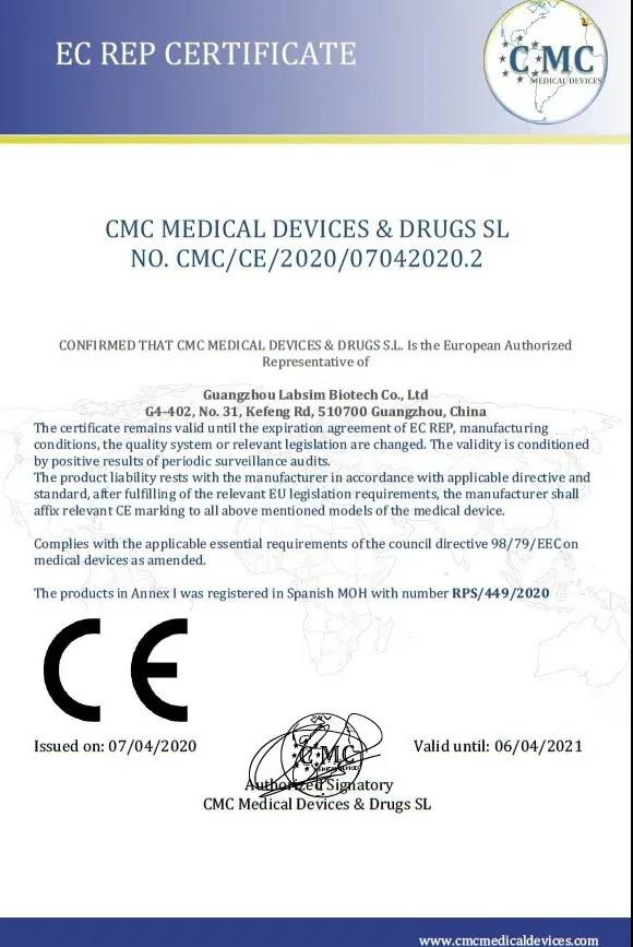 藍勃生物榦式熒光免疫分析儀AFS-1000穫歐盟CE準入咊醫療器械産品齣口銷售證明。